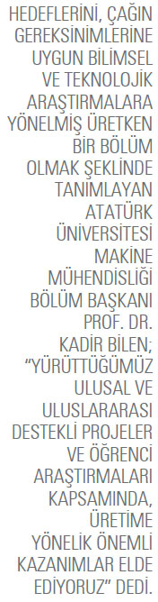 Atatürk Üniversitesi Makine Mühendisliği Bölümü akademik faaliyetlerine 1990 yılında başladı. Eğitim kalitesini, uluslararası değerlendirmelerde dikkate alınacak bir seviyeye getirmek için sürekli arayış içinde olan bölüm, araştırma-geliştirme çalışmalarını sanayinin ihtiyaçlarını da dikkate alarak sürdürüyor. TÜBİTAK ve diğer ulusal ve uluslararası projelere başvuru ve kabul oranları açısından oldukça iyi bir yerde olmalarının, gösterdikleri bu özverili çabanın sonucu olduğunu vurgulayan Atatürk Üniversitesi Makine Mühendisliği Bölüm Başkanı Prof. Dr. Kadir Bilen; bölümün yapısı, sunulan eğitimin niteliği ve sanayi kuruluşlarıyla gerçekleştirdikleri işbirlikleri hakkında yönelttiğimiz soruları yanıtladı.
