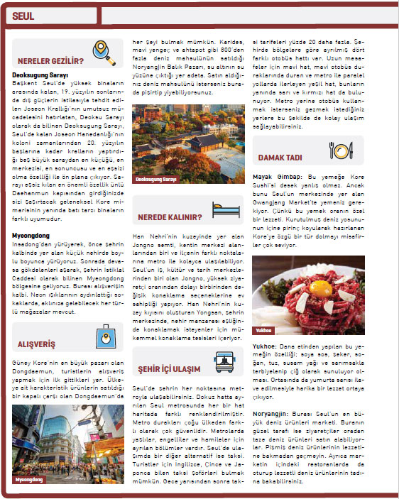Geçen yıllar içinde modern bir yapıya bürünmesinin yanı sıra hala geçmişin izlerine de sahip çıkan dünyanın ender şehirlerinden biri Seul. Şehir, hem modern hem de tarihi yapısıyla göz dolduran bir güzelliğe sahip. Gezdikten sonra şehrin resmini çizmek isteseniz sanırım bir yere tapınak, bir yere saray, bir yere pagoda başka bir yere de bahçe figürleri eklerdiniz.