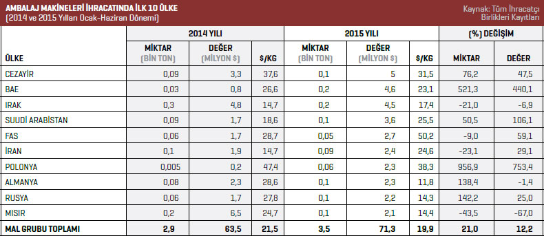 Ambalaj makineleri mal grubunda 2015 yılının Ocak-Haziran döneminde 5 milyon dolarla en fazla Cezayir’e ihracat gerçekleştirildi. Söz konusu ülkeye 2014 yılının aynı döneminde ihraç edilen ürünlerin değeri 3,3 milyon dolar seviyesindeydi. Cezayir’e yönelik ihracat artışı yüzde 47,5 oldu. Listenin ikinci sırasında ise Birleşik Arap Emirlikleri bulunuyor. 2014 yılının Ocak- Haziran döneminde söz konusu ihraç edilen ürünlerin değeri 862 bin dolarken 2015 yılının aynı döneminde bu rakam yüzde 440,1 artışla 4,6 milyon dolar olarak kaydedildi. Üçüncü sıradaki Irak’a 2015 yılının Ocak-Haziran döneminde 4,5 milyon dolarlık ihracat gerçekleştirildi. Dördüncü sıradaki Suudi Arabistan’a 2014 yılının Ocak-Haziran döneminde 1,7 milyon dolar değerinde ambalaj makinesi ihraç edilirken 2015 yılının aynı döneminde bu rakam yüzde 106,1 artışla 3,6 milyon dolar oldu. Beşinci sıradaki Fas’a ise 2015 yılının Ocak-Haziran döneminde ihraç edilen ürünlerin değeri 2,7 milyon dolar olarak kayda geçti. 2014 yılının aynı döneminde bu rakam 1,7 milyon dolardı. Söz konusu ülkeye yönelik ihracat artışı yüzde 59,1 oldu.
