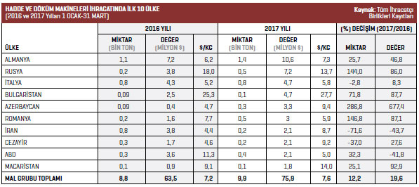 2017 yılının Ocak-Mart döneminde Türkiye geneli hadde ve döküm makineleri sektöründe ihracat artışının en fazla yaşandığı ülke yüzde 677,4 ile Azerbaycan oldu. Listenin ikinci sırasında yüzde 92,9 ile Macaristan yer alırken söz konusu ülkeyi yüzde 87,7 ihracat artışıyla Bulgaristan üçüncü sırada izledi.