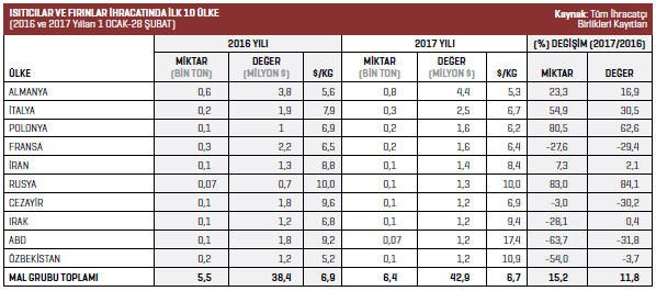 2017 yılının Ocak-Şubat döneminde Türkiye geneli ısıtıcılar ve fırınlar mal grubunda en fazla ihracat artışı yüzde 84,1 ile Rusya’da yaşandı. Bu ülkenin ardından yüzde 62,6 ile Polonya gelirken yüzde 30,5 ile İtalya üçüncü sırada yer aldı.