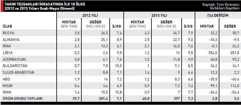 2012 yılının Ocak-Mayıs döneminde 281,4 milyon dolar olan takım tezgahları ihracatı, 2013 yılının aynı döneminde yüzde 5,5 artış kaydederek 297 milyon dolar seviyesine ulaştı. Takım tezgahları ürün grubunda en fazla ihracat gerçekleştirilen ülke Rusya oldu. Rusya’ya 2012 yılının Ocak- Mayıs döneminde 26,5 milyon dolar ihracat değerine sahip takım tezgahı ihraç edilirken bu rakam, yüzde 30,7 artışla 2013 yılının aynı döneminde 34,7 milyon dolar değerine yükseldi. İkinci sırada yer alan Almanya’ya 2013 yılının