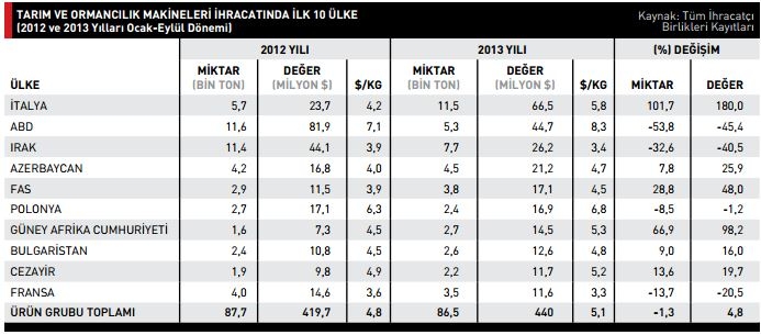 Tarım ve ormancılıkta kullanılan makineler, aksam ve parçaları ürün grubunda 2013 yılı Ocak-Eylül döneminde ihraç edilen ürünlerin değeri 440 milyon dolar oldu. Yüzde 4,8 artışın yaşandığı sektörün 2012 yılı ihracatı 419,7 milyon dolar seviyesindeydi. Tarım ve ormancılıkta kullanılan makineler, aksam ve parçaları ürün grubunda 2013 yılı Ocak-Eylül döneminde en