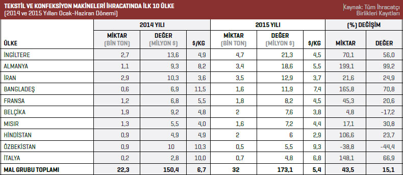 Tekstil ve konfeksiyon makineleri ürün grubu ihracatı 2015 yılının Ocak-Haziran döneminde, 2014 yılının aynı dönemine göre yüzde 15,1 artış göstererek 173,1 milyon dolar değerine ulaştı. Tekstil ve konfeksiyon makineleri mal grubunda 2014 yılının Ocak-Haziran döneminde ihraç edilen ürünlerin değeri ise 150,4 milyon dolar seviyesindeydi. Tekstil ve konfeksiyon makineleri sektöründe 2015 yılının Ocak-Haziran döneminde en fazla ihracat gerçekleştirilen ülke 21,3 milyon dolarla İngiltere oldu. Yüzde 56 artışın yaşandığı söz konusu ülkeye, 2014 yılının aynı döneminde 13,6 milyon dolar değerinde ürün ihraç edilmişti. Listenin ikinci sırasında bulunan Almanya’ya 2015 yılının Ocak-Haziran döneminde 18,6 milyon dolarlık ihracat gerçekleştirildi. 2014 yılının aynı döneminde bu rakam 9,3 milyon dolar seviyesindeydi. Almanya’ya yapılan ihracat artışı yüzde 99,2 olarak kaydedildi. Listenin üçüncü sırasında yer alan İran’a gerçekleştirilen tekstil ve konfeksiyon makineleri ihracatı 2015 yılının Ocak-Haziran döneminde, geçen yılın aynı dönemine göre yüzde 24,9 artış gösterdi. 2014 yılının Ocak-Haziran döneminde 10,3 milyon dolarlık ürün gönderilen İran’a, 2015 yılının aynı döneminde ihraç edilen ürünlerin değeri 12,9 milyon dolara yükseldi. Dördüncü sıradaki Bangladeş’e 2014 yılının Ocak-Haziran döneminde 6,9 milyon dolarlık tekstil ve konfeksiyon makinesi ihraç edilirken 2015 yılının aynı döneminde bu rakam yüzde 70,8 artışla 11,9 milyon dolar oldu. Listenin beşinci sırasında yer alan Fransa’ya 2015 yılının Ocak-Haziran döneminde 8,2 milyon dolar değerinde ihracat gerçekleştirildi. 2014 yılının aynı döneminde bu rakam 6,8 milyon dolardı. Fransa’ya ihracat artışımız yüzde 20,6 oldu.