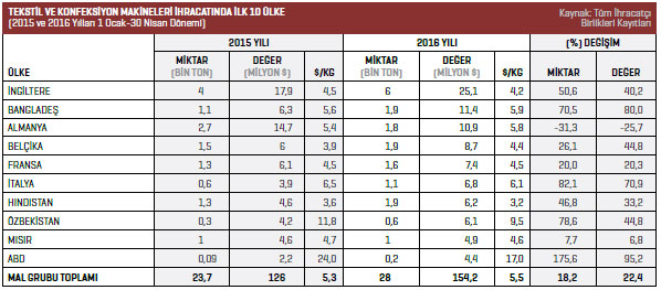2016 yılının Ocak-Nisan döneminde Türkiye geneli tekstil ve konfeksiyon makineleri sektöründe en fazla ihracat artışı yüzde 95,2 ile ABD’de yaşandı. ABD’nin ardından yüzde 80 ile Bangladeş ikinci sırada gelirken yüzde 70,9 ile İtalya üçüncü sırada bulunuyor.