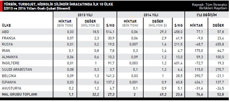 Türbin, turbojet, hidrolik silindir aksam ve parçaları ihracatı 2014 yılının OcakŞubat döneminde bir önceki yılın aynı dönemine göre yüzde 52,8 artış gösterdi.