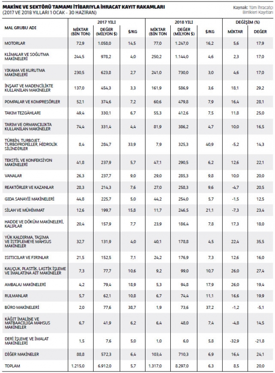 TÜRKİYE’NİN MAKİNE İHRACATI, 2018 YILININ OCAK-HAZİRAN DÖNEMİNDE 8,3 MİLYAR DOLAR OLARAK KAYDA GEÇTİ. 2017 YILININ AYNI DÖNEMİNDE BU RAKAM 7 MİLYAR DOLARDI. TÜRKİYE’NİN MAKİNE İHRACATI, HAZİRAN AYININ SONUNDA GEÇEN YILIN AYNI DÖNEMİNE GÖRE YÜZDE 20 ARTTI.