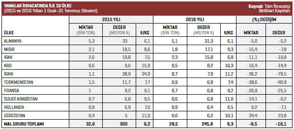 Vanalar ihracatı 2016 yılının Ocak-Temmuz döneminde