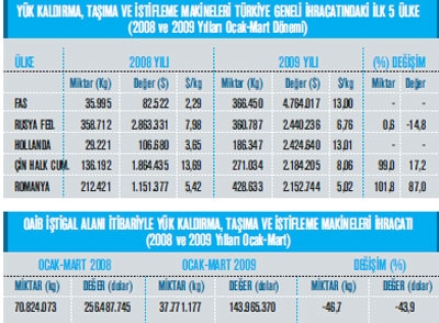 Türkiye yük kaldırma, taşıma ve istifleme makineleri ihracatı geçtiğimiz yılın Ocak-Mart dönemine göre 2009 yılının aynı zaman diliminde yüzde 14,1 oranında değer artışı göstermiş durumda. 2008 yılının ilk üç aylık döneminde 37 milyon 531 bin dolar olan yük kaldırma, taşıma ve istifleme makineleri ihracatı 2009 yılının ilk üç ayına gelindiğinde ise 42 milyon 805 bin dolar olarak gerçekleşmiş. Yük kaldırma, taşıma ve istifleme makineleri ihracatımızın en fazla olduğu ilk 5 ülkeye baktı- ğımız zaman Fas’ın birinci sırada yer aldığı görülüyor. Söz konusu ülkeye 2008 yılının ilk üç ayında 82 bin dolarlık yük kaldırma, taşıma ve istifleme makineleri ihracatı yapılmışken 2009 yılının ilk üç ayında ise 4 milyon 764 bin dolarlık yük kaldırma, taşıma ve istifleme makineleri ihracatı kaydedilmiş. Yük kaldırma, taşıma ve istifleme makineleri ihracatımı- zın en büyük ikinci pazarı ise Rusya Federasyonu olmuş. Rusya Federasyonu’na 2009 yı- lının Ocak-Mart ayları arasında 2 milyon 440 bin dolarlık yük kaldırma, taşıma ve istifleme makineleri ihracatı gerçekleştirilmiş. Rusya’nın ardından en fazla yük kaldırma, taşıma ve istifleme makineleri ihracatı yaptığımız üçüncü ülke olan Hollanda’ya 2008 yılının ilk 3 aylık döneminde 106 bin dolarlı k yük kaldırma, taşıma ve istifleme makineleri ihracatı yapan Firmalarımız bu değeri 2009 yılının aynı dönemine ge- lindiğinde 2 milyon 424 bin dolar seviyesine taşımışlar. Çin Halk Cumhuriyeti de yük kaldı rma, taşıma ve istifleme makineleri ihracatımız açısından önemli bir pazar konumunda bulunuyor. Bu ülkeye geçtiğimiz yılın Ocak-Mart ayları arası nda 1 milyon 864 bin dolar yük kaldırma, taşıma ve istifleme makineleri ihracatı söz konusu iken 2009 yılının Ocak- Mart döneminde ise yüzde 17,2 oranında değer artışı kaydedilerek 2 milyon 184 bin dolarlık ihracat yapılmış. En fazla yük kaldırma, taşıma ve istifleme makineleri ihracatı yaptığımız beşinci ülkenin ise Romanya olduğu görülüyor. Romanya’ya 2008 yılının Ocak-Mart ayında 1 milyon 151 bin dolar olan yük kaldırma, taşıma ve istifleme makineleri ihracatımız 2009 yılının aynı dönemine gelindi- ğinde yüzde 87 oranında artış göstererek 2 milyon 152 bin dolar olmuş. Yük kaldırma, taşıma ve istifleme makineleri ihracatımızın önemli ölçüde artış gösterdi- ği bir diğer ülke ise Suriye. Söz konusu ülkeye 2008 yılı- nın ilk 3 aylık döneminde 363 bin dolarlık yük kaldırma, taşı ma ve istifleme makineleri ihracatı gerçekleştirilmişken 2009 yılının ilk 3 aylık dönemine gelindiğinde ise yüzde 316,9 oranında değer artışı yaşanarak 1 milyon 517 bin dolarlık ihracat seviyesi yakalanmış. Suriye gibi Cezayir’e olan yük kaldırma, taşıma ve istişeme makineleri ihracatımızın da dikkate değer bir bicimde artı ş göstermiş. Cezayir’e 2008 yılının Ocak-Mart döneminde 711 bin dolarlık yük kaldırma, taşıma ve istifleme makineleri ihracatı yapan Firmalarımız 2009 yılının eş zaman dilimine gelindiğinde yüzde 178,1 yükselişle 1 milyon 977 bin dolarlık ihracat yapmışlar.