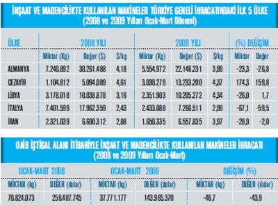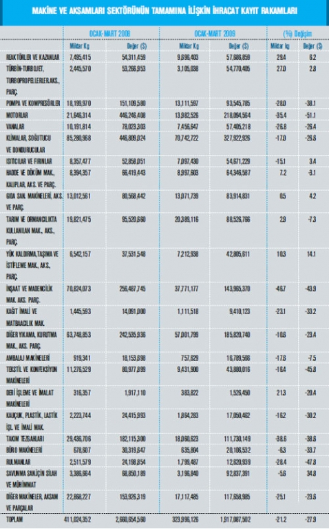 2009 yılı Ocak-Mart döneminde mal grupları bazında en fazla ihracat yapı- lan ülkeler ise, İnşaat ve Madencilik Makinelerinde; Almanya, Cezayir ve Libya; Endüstriyel Klimalar ve Soğutucularda; Irak, İngiltere ve Fransa, Takım Tezgâhlarında; Almanya, Irak ve İran, Pompa ve Kompresörlerde Almanya, İtalya ve Romanya, Tarım ve Ormancılık Makinelerinde; ABD, Fas ve Irak, Gıda İşleme Makinelerinde; Suriye, Irak ve Kazakistan, Vanalarda; Almanya, İspanya ve Irak, Tekstil ve Konfeksiyon Makinelerinde; Sudan, Mısır ve Hindistan, Hadde ve Döküm Makinelerinde; İran, Mısır ve İtalya, Reaktör ve Kazanlarda; İstanbul Deri Serbest Bölgesi, İngiltere ve Almanya, Türbin, Turbojet ve Hidrolik Silindirlerde; ABD, Avusturya ve İsviçre, Yük Kaldırma, Taşıma ve İstifleme Makinelerinde; Fas, Rusya Federasyonu ve Hollanda, Kauçuk, Plastik, Lastik İşleme Makinelerinde; Bursa Serbest Bölgesi, Almanya ve Brezilya, Rulmanlarda; Almanya, Fransa ve İtalya, Ambalaj Makinelerinde ise; Güney Afrika Cumhuriyeti, İtalya ve Irak olmuş.