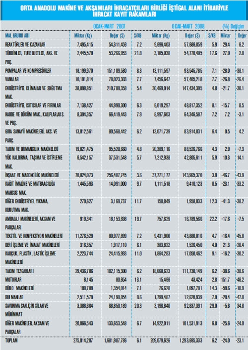 Orta Anadolu Makine ve Aksamları İhracatçıları Birliği iştigal alanına giren GTİP’ler kapsamı nda belirlenen Türkiye geneli ihracat kayıtlarına göre; 2008 yılı Ocak-Mart dönemi ihracat kayıt rakamı 1 milyar 681 milyon dolar iken, bu rakam 2009 yılının eş zaman diliminde yüzde 23,1 oranında azalarak 1 milyar 293 milyon dolar olarak gerçekleşti. Makine sektörü toplamı, 84. faslın tamamı ve 84. fasıl dışı Orta Anadolu Makine ve Aksamları İhracatçıları Birliği iştigal alanı itibariyle 2009 yılının ilk 3 ayında önceki yılın aynı dönemine kıyasla yüzde 27,9 azalarak 1 milyar 917 milyon dolar olarak kaydedildi. Mal grupları bazında incelendiğinde ise; 2008 yılı Ocak-Mart döneminde, ihracatı nda en yüksek artış gerçekleşen kalemler ise yüzde 34,8 ile Savunma Sanayi için Silah ve Mühimmat, yüzde 14,1 ile Yük Kaldırma, Taşıma ve İstifleme Makineleri ve yüzde 8,5 ile Endüstriyel Isıtıcılar ve Fı- rınlar oldu. 2009 yılı Ocak-Mart dönemi ihracatında en fazla gerileme görülen mal grupları ise; Rulmanlar, Motorlar ile Tekstil ve Konfeksiyon Makineleri olarak sıralanıyor. OAİB iştigal alanına giren ürünler itibariyle, mal gruplarının sektör ihracatından aldıkları paylar incelendiğinde ise; 2009 yılı Ocak-Mart döneminde; yüzde 11,4 pay ile Endüstriyel Klimalar ve Soğutma Makineleri birinci, yüzde 11,1 pay ile İnşaat ve Madencilikte Kullanılan Makineler ikinci ve 8,6 pay ile Takım Tezgâhları üçüncü sırada yer alıyor.