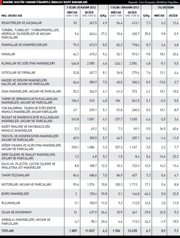 Makine ve aksamları sektöründe2012 yılında ihracatıen fazla yapılan mal grubu reaktör ve kazanlar oldu.Söz konusu mal grubunda 2012 yılıOcak ayında 33 milyon dolar değerinde ürün ihraç edildi. Listenin ikinci sırasında ise türbinler, turbojetler,hidrolik silindirler yer aldı. Listenin üçüncü sırasında ise pompalar ve kompresörler yer aldı.
