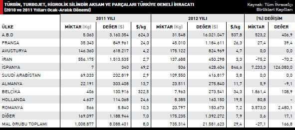 Türbin, turbojet, hidrolik silindir aksam ve parçaları ihracatımız 2012 yılı Ocakayında 22 milyon dolar seviyesine yükseldi. Yüzde 167 oranında önemli bir değer kazanan söz konusu mal grubunda 2011 yılı Ocak ayında 1milyon dolar değerinde ürün ihracatı gerçekleşti.