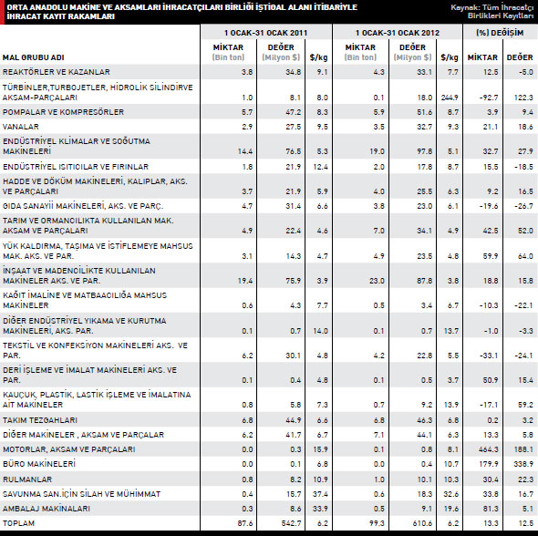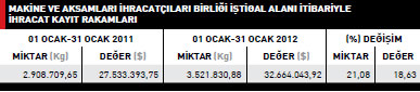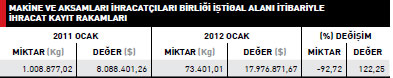 Makine ve aksamları sektöründe 2012 yılı Ocak ayı 2011 yılı aynı dönemi değerlendirmelerinde yüzde 13 oranında artış yaşandı. 2011 yılı Ocak ayında 543 milyon dolar değerinde olan ihracat kayıt rakamı, 2012 yılında611 milyon dolar seviyesine yükseldi.
