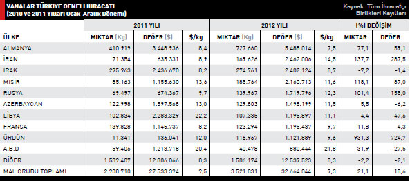 Mısır’a olan ihracatımız yüzde 87 oranında arttı. Söz konusu ülkeye 2012 yılında 2 milyon dolar değerinde vana gönderildi. Rusyaise yüzde 155 oranında artışla 2 milyon dolar ihracat değeriyle beşinci sırada yer aldı. Rusya’ya 2011 yılının Ocak ayında 674 bin dolar değerinde vana ihraç edilirdi.Vanalar sektörü Türkiye geneli ihracat tablosunda en fazla artış yüzde 725 oranıyla Ürdün’e gerçekleştiği dikkat çekiyor. Ürdün’den sonra ikinci sırada yüzde 288 oranında artışla İran yeralıyor. Rusya ise yüzde 155 oranında artışla üçüncülük koltuğuna oturuyor.