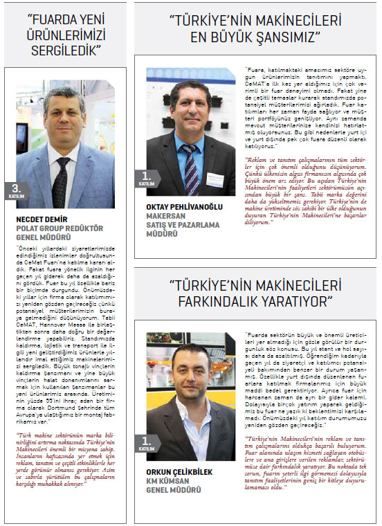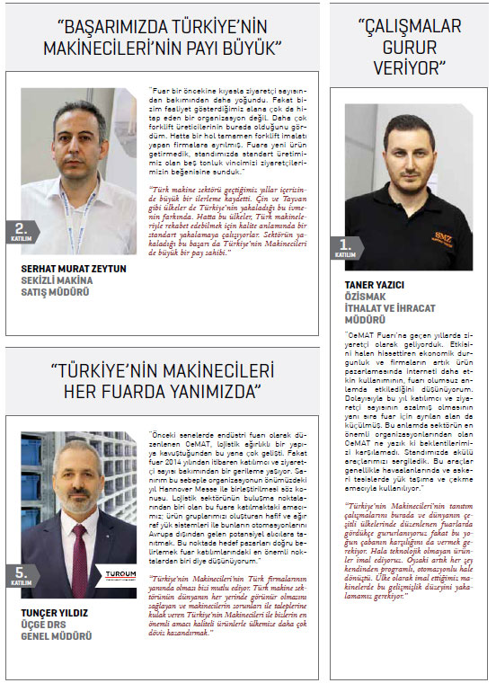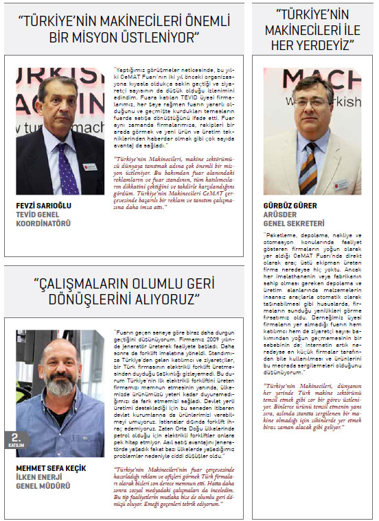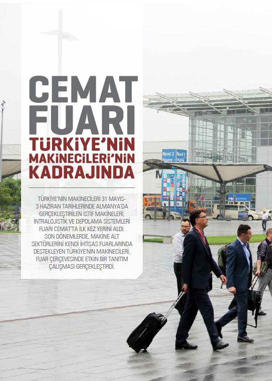 Türkiye’nin Makinecileri, Almanya’nın Hannover kentinde iki yılda bir düzenlenen istif makineleri, intralojistik ve depolama sistemleri fuarı CeMAT’a katılarak ziyaretçileri Türk makine sektörü hakkında bilgilendirdi. 44 ülkeden 1000 firmanın ürünlerini sergilediği fuarı 40 bin kişi ziyaret etti. Fuar, lojistik teknolojileri, taşıma- kaldırma, etiketleme-baskı, depolamayükleme ile bu konulardaki yönetim ve hizmetler dahil olmak üzere beş alt kategoride gerçekleşti. 2014 yılında Türkiye’den 23 firmanın katılım sağladığı fuara bu yıl yüzde 22 oranında artışla 28 Türk firması katıldı.