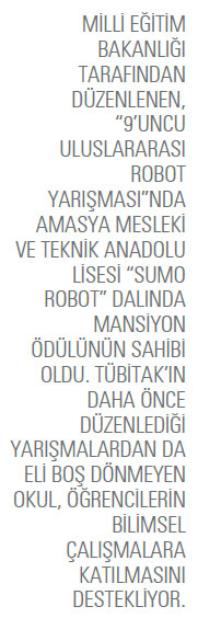 Uzun yıllardan bu yana mesleki eğitime sağladığı katkıyla birçok sektöre kalifiye eleman yetiştiren Amasya Mesleki ve Teknik Anadolu Lisesi (MTAL) hayata geçirdiği bilimsel çalışmalarla da dikkat çekiyor. Geçtiğimiz yıl Milli Eğitim Bakanlığı (MEB) tarafından gerçekleştirilen 9. Uluslararası Robot Yarışması’nda Sumo dalında mansiyon ödülü alan okul, söz konusu dereceyle yarışmanın Japonya’da gerçekleşecek ayağına katılma şansı yakaladı.