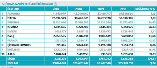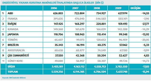 2009 yılında sektör ithalatı yüzde 16 oranında azalarak 6,7 milyar dolar seviyelerinden 5,6 milyar dolar seviyelerine geriledi. ABD 628 milyon dolar ithalat ile dünya sıralamasındaki lider konumunu korudu. ABD’nin ardından endüstriyel yıkama kurutma makinesi ithalatı gerçekleştiren Fransa ise 2009 yılında 503 milyon dolar ithalat gerçekleştirdi. Sektör ithalatında önde gelen diğer ülkeler sırasıyla İsviçre, Kanada ve Japonya’dır. Endüstriyel yıkama ve kurutma makineleri sektörü ithalatında ilk on sırada yer alan ülkelerin hepsinde genel olarak azalış görüldü. Özellikle İsviçre (yüzde 28), Türkiye (yüzde 20), Kanada (yüzde 14) ve ABD (yüzde 14)’nin 2009 yılı ithalatındaki azalış miktarları önemli ölçüdedir.