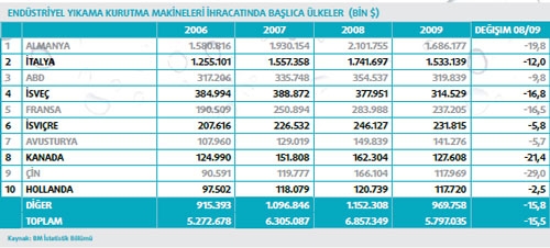 Türkiye’nin endüstriyel yıkama ve kurutma makineleri sektörü ihracatı 2009 yılında 8,2 milyon dolar olarak gerçekleşti. 2010 yılında sektör ihracatı yüzde 65 oranında artarak 13,5 milyon dolar seviyesine yükseldi.