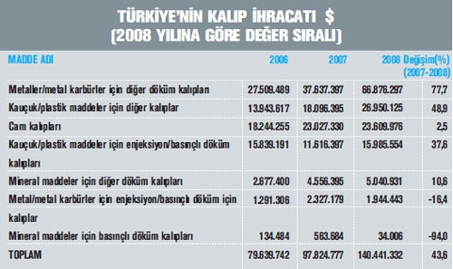 >> 2007 yılında 97,8 milyon dolar ihracat gerçekleştiren Türk kalıp sektörü, 2008 yılında genel makine ve aksamları ihracat artış oranının (%18,2) üzerinde bir performans sergileyerek ihracatını yüzde 43,6 oranında artırdı ve 140,4 milyon dolar seviyesine yükseltti