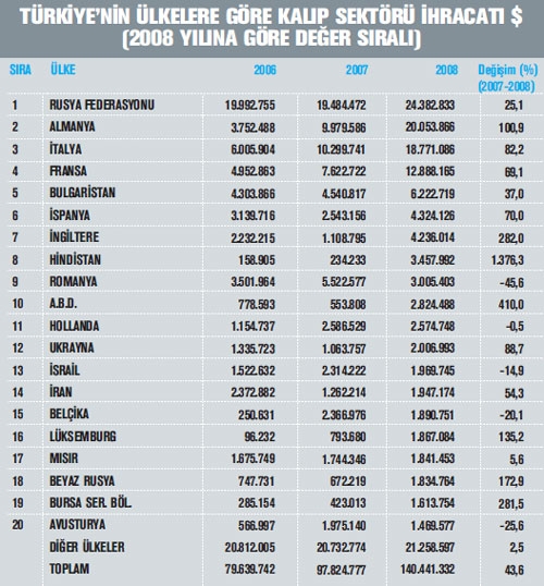.>> 2008 yılında Türkiye’nin kalıp sektörü ihracatı, bir önceki yıla göre yüzde 43,6, ithalatı ise yüzde 13,2 oranı nda artış gösterdi. >> Türk kalıp sektöründe, 2007 yılı ithalat artışına göre dünyada ilk sırada yer alan Rusya’nın, 2008 yılı ihracatı- mızda 24,4 milyon dolar ile birinci konumda yer aldığı, bu ülkeyi 20 milyon dolar ile Almanya ve 18,8 milyon dolar ile İtalya’nın takip ettiği görülüyor.