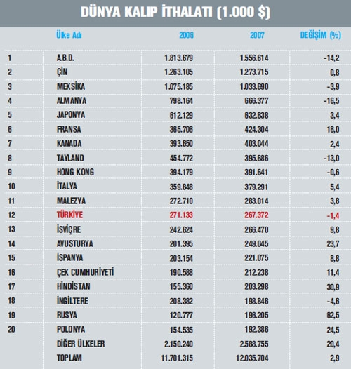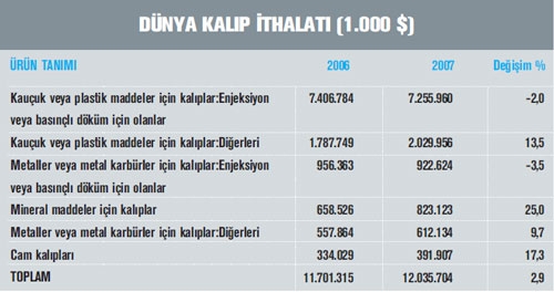 Birleşmiş Milletler (BM) İstatistik Bölümü verilerine göre, 2006 yılında 12,6 milyar dolar olan dünya kalıp sektörü toplam ihracatı yüzde 2,3 oranında artış göstererek 2007 yılında 12,9 milyar dolar değerini aşmış durumda. 2006 yılında dünya kalıp ihracatında büyük bir fark ile ilk sırada yer alan Japonya’nı n ihracatı, 2007 yılında yüzde 5,6 düşüş göstererek 1.783 milyon dolar seviyelerine gerilemesine rağmen sektör ihracatındaki konumunu korumuş bu ülkeyi 1.298 milyon dolar ile Çin ve 1.274 milyon dolar ile İtalya takip etmiş. Kalıp ihraç eden ilk 20 ülke arasında en fazla ihracat artışını yüzde 35 ile Çin, en büyük düşüşü ise yüzde 12,2 ile Almanya kaydetmiş. Türkiye ise, 2007 yılında gerçekleştirdiği 97,8 milyon dolar ihracat ile sektörün dünya ihracatından yaklaşık olarak yüzde 0,8 pay almış ve sıralamada 23. konuma yerleşmiş. Dünya kalıp ithalatına bakıldığında ise 2006 yılında 11,7 milyar dolar olan kalıp sektörü toplam ithalatı yüzde 2,9 oranı nda artış göstererek 2007 yılında 12 milyar dolar değerini aşmış. 2007 yılında yüzde 14,2 oranında azalması na rağmen gerçekleştirdiği 1.557 milyon dolarlık ithalat ile ABD, dünya genelinde kalıp sektöründe ithalat yapan ülkeler arasında lider konumunu korumuş. ABD’yi 1.274 milyon dolar ile Çin ve 1.034 milyon dolar ile Meksika takip etmiş. 2007 yılında, dünya genelinde önemli ülkelerin kalıp ithalatlarındaki artışlar incelendiğinde; yüzde 62 ile Rusya’nın ilk sırada yer aldığı ve bu ülkeyi Hindistan (yüzde 31) ile Polonya’nın (yüzde 24,5) takip ettiği görülüyor. En büyük düşüş ise yüzde 16,5 ile Almanya’da gözlenmiş. 2007 yılında dünya sektör ithalatında yüzde 2,2 pay alan Türkiye ise 267,4 milyon dolar değerinde ithalat gerçekleştirerek 12. ülke konumunda yer almış.