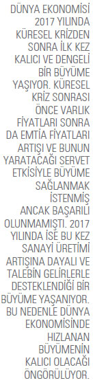 Önceki yıllarda büyüme girişimlerinde bölgesel dengesizlikler yaşanırken 2017 yılındaki büyümede ise tüm gelişmiş ve gelişen ülkelerle tüm bölgelerde büyüme yaşanıyor. Bu nedenle söz konusu büyüme daha sağlıklı, dengeli ve kapsayıcı. 2018 yılında da dünya ekonomisinde kalıcı büyümenin hızlanarak sürmesi bekleniyor. 2017 yılında yüzde 3 olan büyümenin 2018 yılında yüzde 3,3’e çıkacağı öngörülüyor. Gelişmiş ve gelişen ülkelerde büyüme birlikte artacak. Gelişmiş ülkelerde 2017 yılında yüzde 2,2 olan büyüme 2018 yılında yüzde 2,3 olarak bekleniyor. ABD ve AB’de büyüme, yüzde 2,3 ile sürecek. Bazı AB ülkelerinde yüzde 4-5 arasında büyüme bekleniyor. Gelişen ülkelerde de büyümenin hızlanacağı öngörülüyor. Özellikle petrol ve emtia fiyatlarındaki artışla bu ürünlerin üreticisi ve ihracatçısı ülkelerde büyüme yeniden toparlanacak. Çin ise ekonomideki dönüşümünü başarıyla sürdürüyor. Ekonomide kontrollü bir yavaşlama sağlayan Çin, hedeflediği yüzde 6-7 arasındaki büyümeye ulaşıyor. Böylece Çin’le ilgili hedefin üzerinde yavaşlama endişesi giderek azalıyor. Dünya mal ticareti 2015 ve 2016 yıllarında önemli ölçüde daraldıktan sonra 2017 yılında miktar olarak yüzde 3,6 ve değer olarak ise yüzde 7 oranında büyüdü. Böylece dünya mal ticareti 2017 yılında 17,1 trilyon dolara ulaşacak.