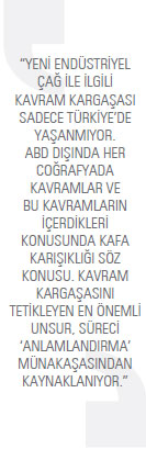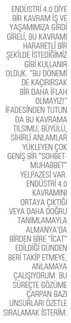 Yeni endüstriyel çağ ile ilgili kavram kargaşası sadece Türkiye’de yaşanmıyor. ABD dışında her coğrafyada kavramlar ve bu kavramların içerdikleri konusunda kafa karışıklığı söz konusu. Kavram kargaşasını tetikleyen en önemli unsur, süreci “anlamlandırma” münakaşasından kaynaklanıyor. Çünkü her devlet, sivil toplum, işletme ve birey; endüstriyel tarihine, gelişmişliğine ve bazen de ihtiyaçlarına göre yeni kavramların içini dolduruyor. Yani, yeni bir kavramın Türkiye’de algısıyla anlamı başka, Çin’de daha bir başka olabilir ve oluyor da. Ama zamanla bu kavram ve içerdikleri evrenselleşecek. İşte bu süreçte belirleyici olan gücün kurduğu, kuracağı kavram hegemonyası yarınımızı şekillendirecek. Şimdilerde Almanlar da mevcut kavram kargaşasından şikâyetçi. Geçtiğimiz yıl kurulan ve yaklaşık 40 değişik saha uzmanından oluşan bir komisyon, Endüstri 4.0 ve/veya buna bağımlı türetilen kavramların içeriği konusunda anlaşma sağlamak için büyük çaba gösteriyor. Her gün yenisi eklenen kavramlarla tartışmalar sürüp gidiyor. Belki sizlerin de dikkatini çekmiştir, Endüstri 4.0 genel kavramının dışında bu tartışmalarda, adlandırmalarda Almanca bir kelime ve kavram yok. Maşallah hepsi İngilizce. Aslında bu bile bizlere hâlihazırda trendin belirleyicisinin kim olduğunu gösteriyor. İlerde bu nasıl değişecek veya değişecek mi, hep beraber izleyeceğiz.