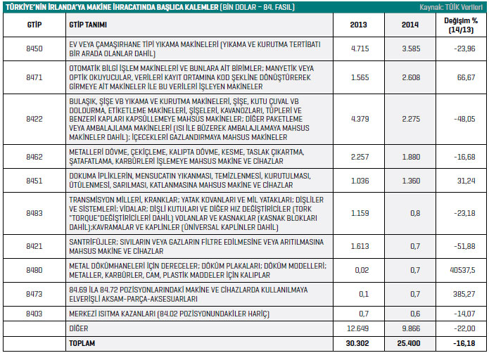TÜİK verilerine göre Türkiye’nin 84’üncü fasılda İrlanda’ya gerçekleştirdiği makine ihracatı, 2015 yılında 25,4 milyon dolar olarak kaydedildi. 2014 yılında bu rakam 30,3 milyon dolar seviyesindeydi. İrlanda’ya gerçekleştirdiği makine ihracatı yüzde 16,18 azaldı. Türkiye’nin İrlanda’ya gerçekleştirdiği makine ihracatının ilk sırasında ev veya çamaşırhane tipi yıkama makineleri (yıkama ve kurutma tertibatı bir arada olanlar dahil) yer alıyor. Söz konusu kalemde İrlanda’ya 2014 yılında 4,7 milyon dolar değerinde ürün ihraç edilirken, bu rakam 2015 yılında 3,5 milyon dolar seviyesinde kaydedildi. Söz konusu mal grubunda 2015 yılında ihracat yüzde 23,96 azaldı. Listenin ikinci sırasında bulunan otomatik bilgi işlem makineleri ve bunlara ait birimler; manyetik veya optik okuyucular, verileri kayıt ortamına kod şekline dönüştürerek girmeye ait makineler ile bu verileri işleyen makineler ürün grubunda 2015 yılında gerçekleştirilen ihracatın değeri 2,6 milyon dolar olarak kaydedildi. 2014 yılında bu rakam 1,5 milyon dolardı. Otomatik bilgi işlem makineleri ve bunlara ait birimler; manyetik veya optik okuyucular, verileri kayıt ortamına kod şekline dönüştürerek girmeye ait makineler ile bu verileri işleyen makineler ürün grubundaki ihracat yüzde 66,67 arttı. Türkiye’nin İrlanda’ya makine ihracatında ilk 10 ürün grubu listesinin üçüncü sırasında ise bulaşık, şişe vb. yıkama ve kurutma makineleri, şişe, kutu çuval vb. doldurma, etiketleme makineleri, şişeleri, kavanozları, tüpleri ve benzeri kapları kapsüllemeye mahsus makineler; diğer paketleme veya ambalajlama makineleri (ısı ile büzerek ambalajlamaya mahsus makineler dahil); içecekleri gazlandırmaya mahsus makineler bulunuyor. 2014 yılında söz konusu kalemde 4,3 milyon dolarlık ihracat gerçekleştirilirken bu rakam, 2015 yılında yüzde 48,05 azalarak 2,2 milyon dolar oldu. TÜİK verilerine göre 84’üncü fasıl itibariyle Türkiye’nin İrlanda’dan 2014 yılında gerçekleştirdiği 116 milyon dolarlık makine ithalatı, 2015 yılına gelindiğinde yüzde 16.91 oranında azalarak 96,5 milyon dolara geriledi.