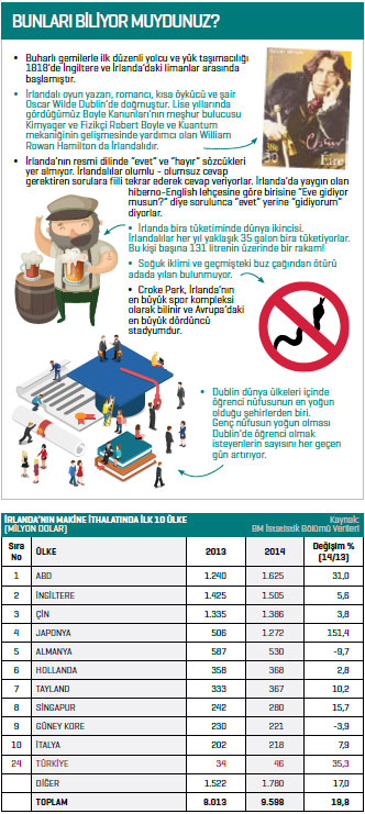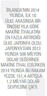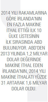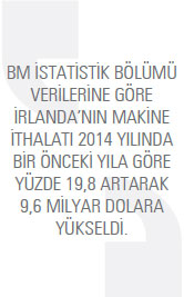 BM İstatistik Bölümü verilerine göre İrlanda’nın makine ithalatı 2014 yılında bir önceki yıla oranla yüzde 19,8 artarak 9,6 milyar dolar oldu. 2013 yılında bu rakam 8 milyar dolar seviyesindeydi. 2014 yılı rakamlarına göre İrlanda’nın en fazla makine ithal ettiği ilk 10 ülke listesinin ilk sırasında ABD bulunuyor. ABD’den 2013 yılında 1,2 milyar dolar değerinde makine ithal eden İrlanda’nın, 2014 yılı makine ithalatı yüzde 31 artarak 1,6 milyar dolar oldu. İrlanda, 2014 yılında listenin ikinci sırasında bulunan İngiltere’den 1,5 milyar dolar değerinde makine ithal etti. 2013 yılında bu rakam 1,4 milyar dolar seviyesindeydi. 2014 yılında İrlanda’nın İngiltere’den gerçekleştirdiği makine ithalatı yüzde 5,6 arttı. İrlanda’nın 2014 yılında en fazla makine ithal ettiği ilk 10 ülke listesinin üçüncü sırasında ise Çin yer alıyor. İrlanda 2013 yılında Çin’den 1,33 milyar dolar değerinde makine ithal ederken bu rakam, 2014 yılında yüzde 3,8 artarak 1,38 milyar dolar oldu. İrlanda’nın 2014 yılında, ilk 10 ülke arasında bir önceki yıla göre makine ithalatını en fazla artırdığı ülke Japonya oldu. Japonya’dan 2013 yılında 506 milyon dolar değerinde makine ithal edilirken 2014 yılında bu rakam yüzde 151,4 artışla 1,2 milyar dolar seviyesine çıktı. Türkiye, 46 milyon dolarla İrlanda’nın 2014 yılında en fazla makine ithal ettiği ülkeler listesinin 24’üncü sırasında bulunuyor. 2013 yılında bu rakam 34 milyon dolar seviyesindeydi. 2014 yılında İrlanda’nın Türkiye’den gerçekleştirdiği makine ithalatı yüzde 35,5 arttı.