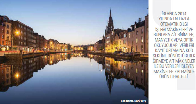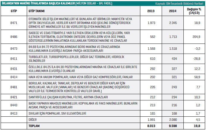 İrlanda 2014 yılında en fazla otomatik bilgi işlem makineleri ve bunlara ait birimler; manyetik veya optik okuyucular, verileri kayıt ortamına kod şekline dönüştürerek girmeye ait makineler ile bu verileri işleyen makineler kaleminde ürün ithal etti. 2013 yılında söz konusu ürün grubunda 1,9 milyar dolarlık ithalat gerçekleştirilirken bu rakam, 2014 yılında yüzde 18,9 artarak 2,3 milyar dolar olarak kayda geçti. Listenin ikinci sırasında sadece ve esas itibariyle yarı iletken disklerin veya külçelerin, yarı iletken tertibatın, elektronik entegre devrelerin veya düz panel göstergelerinin imalatında kullanılan türdeki makine ve cihazlar bulunuyor. İrlanda, 2014 yılında söz konusu kalemde 1,7 milyar dolar değerinde makine ithal etti. 2013 yılında bu rakam 562 milyon dolardı. İrlanda’nın söz konusu ürün grubundaki ithalatı 2014 yılında yüzde 204,9 arttı. İrlanda’nın en fazla ithalat gerçekleştirdiği üçüncü kalem 84.69 ila 84.72 pozisyonlarındaki büro makine ve cihazlarında kullanılmaya elverişli aksam-parça-aksesuarları oldu. 2013 yılında söz konusu ürün grubunda 1,56 milyar dolarlık ithalat gerçekleştirilirken bu rakam, 2014 yılında yüzde 3,2 azalarak 1,51 milyar dolar oldu. İrlanda’nın 2014 yılında makine ithalatında en fazla artış yüzde 204,9 ile sadece ve esas itibariyle yarı iletken disklerin veya külçelerin, yarı iletken tertibatın, elektronik entegre devrelerin veya düz panel göstergelerinin imalatında kullanılan türdeki makine ve cihazlar kaleminde gerçekleşti.