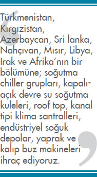 Türkmenistan, Kırgızistan, Azerbaycan, Sri lanka, Nahçıvan, Mısır, Libya, Irak ve Afrika’nın bir bölümüne; soğutma chiller grupları, kapalı-açık devre, su soğutma kuleleri, roof top, kanal tipi klima santralleri, endüstriyel soğuk depolar, yaprak ve kalıp buz makineleri ihraç ediyoruz. Türk Cumhuriyetlerinde daha çok tanınmaya ve ürünlerimize yönelmelerini sağlamaya çalışıyoruz. Çünkü bu bölgelerin Avrupa’dan daha fazla ürün tercih ettiğini biliyoruz. Firmamızın Türkiye’deki satış potansiyelimiz oldukça yüksek, bu potansiyeli yurt dışında da yakalamak istiyoruz. Yurt içindeki rakiplerimiz imal ettiğimiz makineleri ithal ediyor, eğer Türkiye’de onların önüne geçebiliyorsak bunu yurt dışında da yapabiliriz.