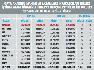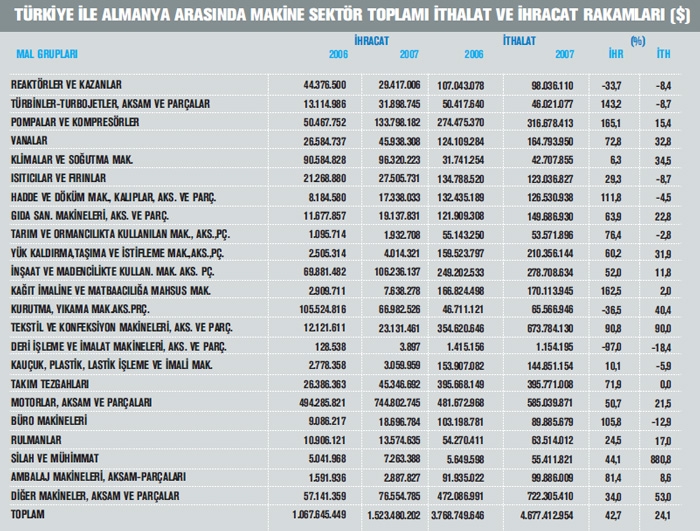 TÜİK verilerine göre Almanya’ya yönelik olarak, OAİB iştigal alanına, 84. fasılda olup, OAİB iştigal alanında bulunmayan GTİP’lerin eklenmesiyle oluşturulan makine sektörü toplamı ihracatı, 2007 yılında bir önceki yıla göre yaklaşık yüzde 43 artarak 1,5 milyar dolara ulaşmış durumda. 2007 yılında Almanya’ya yönelik makine sektör toplamı ihracatında, 745 milyon dolarlık ihracat ile motorlar aksam ve parçaları mal grubunun ilk sırada yer aldığı görülüyor. Bu ürün grubunu, 134 milyon dolar ile pompa ve kompresörler, 96 milyon dolar ile klima ve soğutma makineleri mal grupları takip ediyor. 84. fasıl itibarı ile değerlendirildiğinde, sektör ihracatında önemli yer tutan kalemler arasında; en yüksek ihracat artışı “sıvılar için pompalar, sıvı elevatörleri” kaleminde kaydedilmiş olup, bu kalemin ihracat değerinin yaklaşık 32 milyon dolardan 104 milyon dolara ulaştığı ve yüzde 227,9 oranında bir büyüme gerçekleştirdiğ i görülüyor. İhracat oranındaki büyümede, bu ürün grubunu, ihracat rakamı nı 5,1 milyon dolardan 11,7 milyon dolara çıkaran ve yüzde 127,7 oranında büyüme gerçekleştiren 8456 ve 8465 GTİP’lerinde bulunan makinelerin aksam ve parçaları takip ediyor. Bir diğer dikkat çeken büyüme oranı ise yüzde 123,9’luk oranla turbojetler, turbo-propeller, diğer gaz türbinleri ürün grubunda yaşanmış durumda.