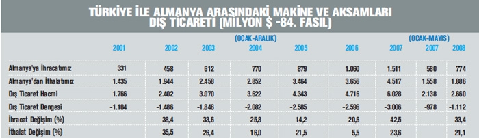 Makine sektör toplamı itibariyle Türkiye’nin Almanya’dan ithalatının, 2007 yı- lında bir önceki yıla göre yüzde 24,1’lik artışla 4 milyar 677 milyon dolar olarak gerçekleştiği görülüyor. Almanya’dan en fazla ithal edilen mal grubu, 722 milyon dolar ile diğer makineler, aksam ve parçaları olurken, 585 milyon dolarlık ithalat ile motorlar, aksam ve parçaları ikinci sı- rada yer alıyor. 2007 yılında makine sektör toplamı ithalatında en fazla artışın, silah ve mühimmat mal grubunda gerçekleşmiş olması dikkat çekiyor. 2007 yılında Türkiye’nin Almanya’dan 84. fasıl itibariyle en fazla ithal ettiği mal grubu, 417 milyon dolar ile dizel, yarı dizel motorlar olurken, bu ürün grubunu 399 milyon dolar ile lifleri hazırlayan, iplik üreten, hazırlayan makineler, 387 milyon dolar ile kendine özgü fonksiyonlu makine ve cihazlar takip ediyor. Sektörde en yüksek ithalat artışının yüzde 328 ile lifleri hazırlayan, iplik üreten ve hazırlayan makinelerde yaşandığı görülüyor. Bu grubu yüzde 101 artış ile kendine özgü fonksiyonlu makine ve cihazlar ve yüzde 56 yükselişle kaldırma, istifleme, yükleme, boşaltma, makine ve cihazları takip ediyor. İthalatında düşüş yaşanan ürün grupları ise, yüzde 13,2’lik düşüşle buhar kazanları dışında kalan merkezi ısıtma ka- zanları, yüzde 5,9’luk düşüşle kauçuk, plastik eşya imal ve işleme makine ve cihazları ve yüzde 4,1’lik azalışla dokuma maddelerini yıkama, kurutma, ütüleme makine ve cihazları şeklinde sıralanıyor. 2007 yılında Türkiye’nin Almanya’ya OA- İB iştigal alanı itibariyle makine ve aksamları ihracatının bir önceki yıla kıyasla yüzde 62 artarak 626 milyon dolar olarak gerçekleştiği görülüyor. Türkiye’nin sektör ihracatından yüzde 10,8’lik pay alan Almanya, Türkiye açısından, sektörün en önemli pazarı konumunda duruyor. TÜİK kayıtlarına göre; 2008 yılı ilk beş ayında Türkiye’nin Almanya’ya toplam ihracatının yüzde 26,2 artışla 5,8 milyar dolar, OAİB iştigal alanı itibariyle yılın ilk 6 ayında makine ve aksamları ihracatının da yüzde 25,2 artışla 343 milyon dolar seviyesinde kaydedildiği görülüyor. 84. fasıl itibariyle Almanya ile Türkiye arasındaki makine dış ticaret hacmi son yıllarda artı ş gösteriyorken, dış ticaret açığımız da artıyor. Bununla birlikte, son yedi yıldır Almanya’ya yönelik makine ihracat artışı- mızın, Almanya’dan makine ithalat artışı- mızın üzerinde seyretmiş olması ileriye dönük olumlu sinyaller veriyor. Özellikle 2007 yılında sektörde yüzde 42,5 ile Türkiye’nin Almanya’ya en büyük ihracat artı ş oranı kaydedilmiş bulunuyor.