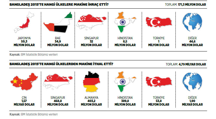 BM İstatistik Bölümü verilerine göre Bangladeş’in makine ihracatı 2015’te 171,3 milyon dolar olarak kayda geçerken, ülke 2015’te 50,3 milyon dolarla en fazla Japonya’ya makine ihraç etti. Bangladeş’in 2015’te en fazla makine ihraç ettiği ikinci ülke 34,9 milyon dolarla Birleşik Arap Emirlikleri oldu. Üçüncü sırada bulunan Singapur’a 2015’te 32 milyon dolarlık makine ihraç edilirken, dördüncü sıradaki Hindistan’a ihraç edilen makinelerin değeri 8,5 milyon dolar oldu. Beşinci sıradaki Vietnam’a ise Bangladeş’in 2015’teki makine ihracatı 5,4 milyon dolar olarak kayda geçti.