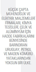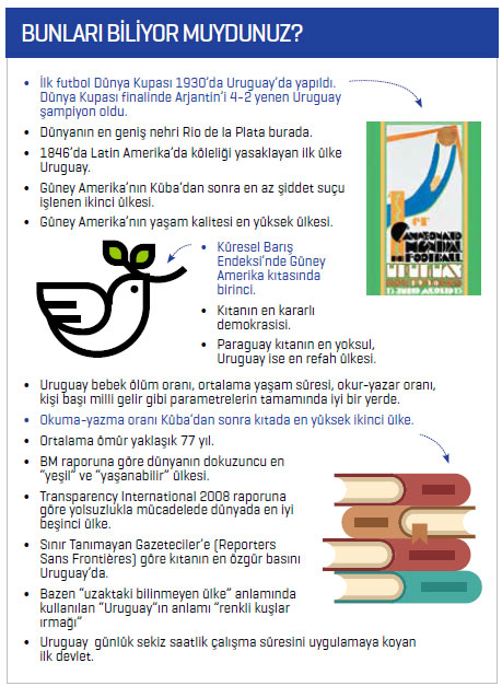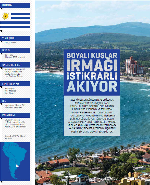 esi. Arjantin’in komşusu olan Uruguay, doğal güzellikleri ve kültürü ile de etkileyici bir coğrafyanın ev sahibi. Yaklaşık 50 milyar dolarlık GSYH ile mikro bir ekonomik büyüklüğe sahip Uruguay, MERCOSUR ülkeleri (Brezilya, Arjantin, Uruguay, Paraguay ve Venezuela) arasında küresel krizden en az etkilenen yapısıyla da karşımıza çıkıyor. Güney Amerika’nın ise ekonomik ve siyasal açıdan en dengeli ülkelerinden biri kabul ediliyor. Kıtanın en bilinen ülkesi Brezilya’nın geçtiğimiz Temmuz ayında yaşadığı ekonomik kriz düşünüldüğünde, kıtanın bu en az bilinen ülkesinin ekonomik ve toplumsal açıdan istikrarlı olması biraz şaşırtıcı gelebiliyor.