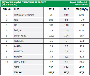 2016 yılı rakamlarına göre Guyana’nın en fazla makine ithal ettiği ilk 10 ülke listesinin ilk sırasında 94,8 milyon dolarla Trinidad ve Tobago yer alıyor. Söz konusu ülkeden 2015 yılında ithal edilen makinelerin değeri 15 milyon dolardı. Guyana’nın Trinidad ve Tobago’dan gerçekleştirdiği ithalat yüzde 529,9 artarken, Guyana, listenin ikinci sırasında bulunan ABD’den yüzde 3,2 azalışla 88 milyon dolarlık alım yaptı. Listesinin üçüncü sırasındaki Çin’den 2015 yılında 16,9 milyon dolarlık ithalat gerçekleştiren Guyana, 2016 yılında ise yüzde 0,6 azalışla 16,8 milyon dolarlık makine ithal etti.