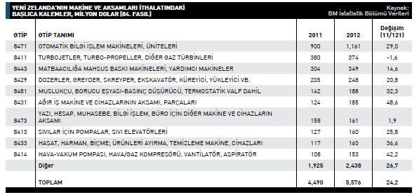 Söz konusu ürün grubunda Yeni Zelanda’nın ihracatı 2012 yılında 85 milyon dolar oldu. Yeni Zelanda’nın genel ithalatında makine ve aksamları sektörünün aldığı pay yüzde 13 oldu. 84. fasıl bazında makine ithalatı 2012 yılında bir önceki yıla göre yüzde 24,2 oranında artış göstererek 5,6 milyar dolara yükseldi. Yeni Zelanda’nın makine ve aksamları ithalatında ilk sırada 1,5 milyon dolarla Çin yer aldı. Artış bir önceki yıla göre yüzde 33,3 oldu. İkinci sırada bulunan ABD’den yapılan ithalat 2012 yılında 893 milyon dolar olarak kayda geçti. Üçüncü sıradaki Japonya’dan yapılan ithalat ise 2011 yılında 363 milyon dolar seviyesinden, 2012 yılında yüzde 41,8 artışla 514 milyon dolara yükseldi.