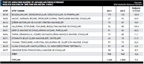 Ülkemizin Yeni Zelanda’ya gerçekleştirdiği makine ve aksamları ihracatı 2012 yılında yüzde 0,3 azalırken makine ve aksamları dış ticaret hacmi yüzde 2 artış kaydetti. 2012 yılında Türkiye’nin Yeni Zelanda’ya ihraç ettiği ürünlerin değeri 8,7 milyon dolar oldu. 84. fasılda bulaşık, şişe vb yıkama ve kurutma makineleri, şişe, kutu çuval vb. doldurma, etiketleme makineleri 2,1 milyon dolarla, en fazla ihraç edilen ürünler listenin ilk sırasında bulunuyor.