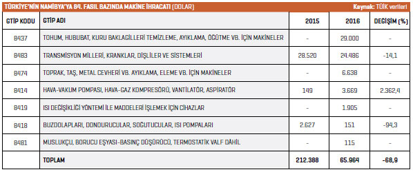 Türkiye, Namibya’nın makine ithalatında 2014 yılında 32’nci sırada yer almıştı. Güncel TÜİK verilerine göre, Türk makine üreticileri 2016 yılını yüzde 70’e varan bir kayıpla kapatmış durumda. Bu kapsamda, 2016’da Türk üreticiler Namibya’ya sadece 66 bin dolarlık makine ihracat yapabildi. Bu dönemde gerçekleşen makine ihracatı içinde ilk sırada 8437 GTİP kodlu “Tohum, hububat, kuru baklagilleri temizleme, ayıklama, öğütme için makineler” ürün grubu yer alırken, söz konusu kalemde Namibya’ya 29 bin dolarlık makine ihraç edildi. Listenin ikinci sırasında bulunan 8483 GTİP kodlu “Transmisyon milleri, kranklar, dişliler ve sistemleri” ürün grubunda ise yüzde 14’lük bir kayıpla 24 bin 500 dolarlık makine ihracatı yaşandığı görülüyor. Üçüncü sıradaki 8474 GTİP kodlu “Toprak, taş, metal cevheri ayıklama, eleme için makineler” ürün grubunda ise 6 bin 600 dolarlık ihracat gerçekleştirilmiş.