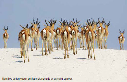 rağmen, tropik altı iklim nedeniyle son derece kurak topraklara sahip. Bölgedeki ilk yerleşimlerin MÖ 3000’e kadar uzandığı Namibya, adını, Atlantik Okyanusu kıyısında bin 600 kilometre boyunca uzanan ve 50 bin metrekarelik alana yayılan, UNESCO Dünya Mirası Listesi’ndeki Namib Çölü’nden almış. Namib kelimesi ise Nama dilinde “çok büyük” anlamına geliyor. Batısında Namib Çölü, güney ve doğusunda ise Kalahari Çölü’nün yer aldığı Namibya, dünyanın en az nüfus yoğunluğuna sahip ülkelerinden biri.