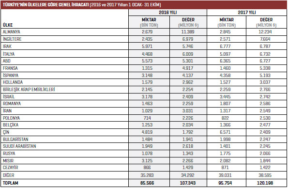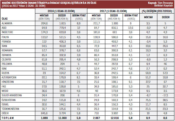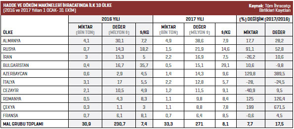 Hadde ve döküm makineleri ürün grubunda 2017 yılının Ocak-Ekim döneminde 271 milyon dolar değerinde ihracat gerçekleştirildi. 2016 yılının aynı döneminde bu rakam 230,7 milyon dolardı.