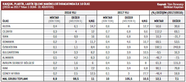 Kauçuk, plastik, lastik işleme makineleri ihracatı 2016 yılının Ocak-Ağustos döneminde 98,5 milyon dolarken 2017 yılının aynı döneminde bu rakam yüzde 7,1 artışla 105,5 milyon dolar oldu. Kauçuk, plastik, lastik işleme makineleri mal grubunda 2017 yılının Ocak-Ağustos döneminde 8 milyon dolarla en fazla Rusya’ya ihracat gerçekleştirildi. 2016 yılının aynı döneminde bu rakam 6,1 milyon dolardı.