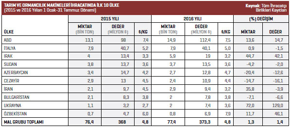 2016 yılının Ocak-Temmuz döneminde tarım ve ormancılıkta kullanılan makineler, aksam ve parçaları kaleminde en fazla ABD’ye ihracat gerçekleştirildi. Bir önceki yıla oranla yüzde 14,7 ihracat artışının yaşandığı ABD’ye 2015 yılının Ocak-Temmuz döneminde 98 milyon dolar ihracat değerine sahip ürün gönderilirken bu rakam, 2016 yılının aynı döneminde 112,4 milyon dolara yükseldi. Listenin ikinci sırasında yer alan İtalya’ya 2016 yılının Ocak-Temmuz döneminde 40,1 milyon dolarlık ihracat gerçekleştirildi. Üçüncü sıradaki Irak’a 2015 yılının Ocak-Temmuz döneminde ihraç edilen tarım ve ormancılıkta kullanılan makineler, aksam ve parçalarının toplam değeri 13,4 milyon dolarken 2016 yılının aynı döneminde bu rakam yüzde 42,1 artışla 19 milyon dolar olarak kaydedildi. Dördüncü sırada bulunan Sudan’a 2016 yılının Ocak-Temmuz döneminde ihraç edilen tarım ve ormancılıkta kullanılan makineler, aksam ve parçalarının değeri 13,5 milyon dolar oldu. Beşinci sıradaki Azerbaycan’a 2016 yılının Ocak-Temmuz döneminde 12,8 milyon dolarlık ihracat gerçekleştirildi.