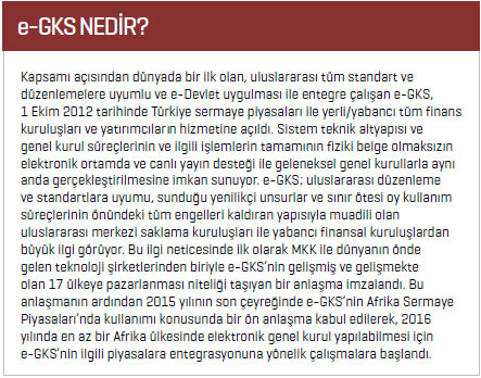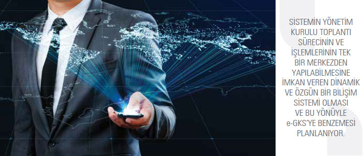 Merkezi kayıt sistemi tarafından yazılan ve özellikle Borsa İstanbul’da işlem gören çok uluslu şirketlerin yönetim kurulu toplantılarının elektronik ortamda yapılmasına olanak sağlaması hedeflenen e-YKS, geçtiğimiz yıllarda talep yetersizliği nedeniyle ertelenmişti. Sistemin TTK’de yapılan düzenlemelerin ardından bu yıl sonuna kadar kullanıma hazır hale getirilmesi planlanıyor.
