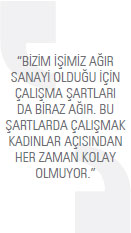 Bizim işimiz ağır sanayi olduğu için çalışma şartları da biraz ağır. Bu şartlarda çalışmak kadınlar açısından her zaman kolay olmuyor. Özellikle çocuk sahibi olduktan sonra işi bırakan kadın çalışanlarımız oldu. Yetişmeleri için harcanan emek açısından üzülüyorum, çok yakında bir personelim beş yıl sonra bu sebeple işi bırakma kararı aldı. Bu, onun için “Tam yetişti!” dediğim zamandı. Onların bu kararlarını saygıyla karşılıyorum; çocuklarıyla vakit geçirmek, büyütmek istiyorlardır. Umarım çocukları okula başlayınca pişman olmazlar; çünkü bu kez beş, altı yıl ara verdikleri iş hayatı, artık çok hızlı akan zamanın getirdiği değişiklikler nedeniyle yeniden dönmelerini zorlaştıracaktır.
