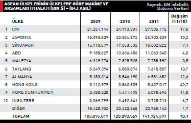 ASEAN ülkelerinden makine ve aksamları ithalatımızda ilk sırayı “Otomatik Bilgi İşlem Makineleri, Üniteleri” almakta olup, 2011 yılında ilk 10 ürün arasında en fazla ithalat artışı yüzde 1.614 oranıyla “Tav Ocakları, Döküm Potaları, Külçe Kalıpları Döküm Makineleri” grubunda gerçekleşti.İthalat değeri 23 milyon dolar oldu. Toplam makine ithalatımız 2011 yılında 554 milyon dolar değerinde kaydedildi.