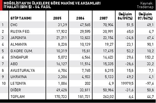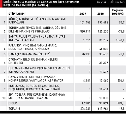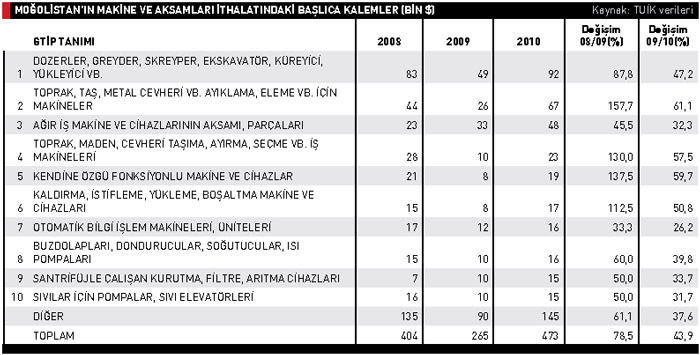 Moğolistan 2009 yılında 49 milyon dolar ithalat yaparken 2010 yılında bu rakam 92 milyon dolara yükseldi. Sıralamanın ikinci sırasında ise toprak, taş, metal cevheri ayıklama ve eleme için kullanılan makineler var. Yüzde 61 oranında artışın yaşandığı kalemde ise 2010 yılında 67 milyon dolar ithalat yapıldı. Ağır iş makineleri aksam ve parçaları ise sıralamada üçüncü sırada yer