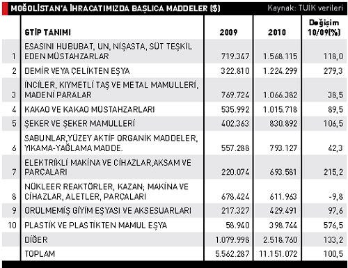 Esasını hububat, un, nişasta, süt teşkil eden müstahzarlar ihracatı 2010 yılında 1 milyon 568 bin dolar olarak gerçekleşti. Moğolistan’a tüm ürünlerde toplam ihracatımız 2009 yılına göre yüzde 101 oranında artarak 2010 yılında 11 milyon dolar olarak gerçekleşti. Aynı dönemde en fazla ihracat 1 milyon 568 bin dolar ile esasını hububat, un, nişasta, süt teşkil eden müstahzarlar kaleminde oldu. Yine 2010 yılının 2009 yılı değişim oranına bakıldığında en fazla ihracat artışı yüzde 577 ile plastik ve plastikten