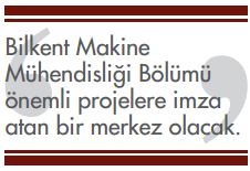 olduğumuz rahatlıkla söyleyebilirim. Ancak sanayi ve üniversite işbirliğini arzulanan düzeye çıkarmış ülkeler gelişmeleri daha hızlı hayata geçirebiliyor. Bölümümüzde ele alınan konular ve eğitim stratejisi öğrenme ve öğrenilen konuları hayata geçirilme hızı önümüzdeki dönemlerde daha da artacak. Bilkent Makine Mühendisliği Bölümü’nün de zaman içinde önemli projelere imza atan bir merkez olacağının müjdesini verebilirim. Teknoloji takip eden ülke statüsünden teknoloji geliştiren ülkeler düzeyine ulaşmak için önemli hamleler yapmak zorundayız. Başarıya ulaşmak için eğitim politikalarını çağa uygun hale getirmeliyiz. Öğrencilerimiz ile öğretim üyelerimizin çok yakın işbirliği ve iletişim içinde olduklarını rahatlıkla söyleyebilirim. Geleceğin teknolojilerini üretebilecek yeni nesiller yetiştirmek için pratik ve teorik altyapıyı hep birlikte oluşturmalıyız.